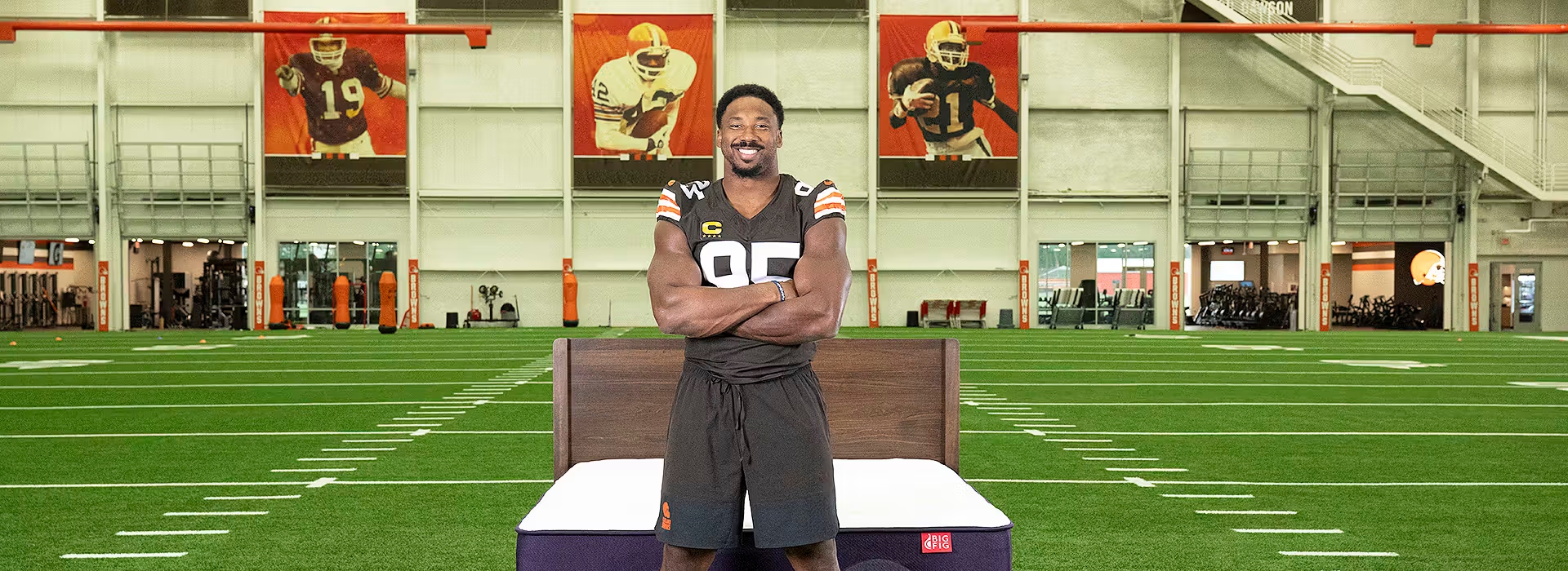 Myels Garrett in team uniform on Big Fig mattress on the practice field