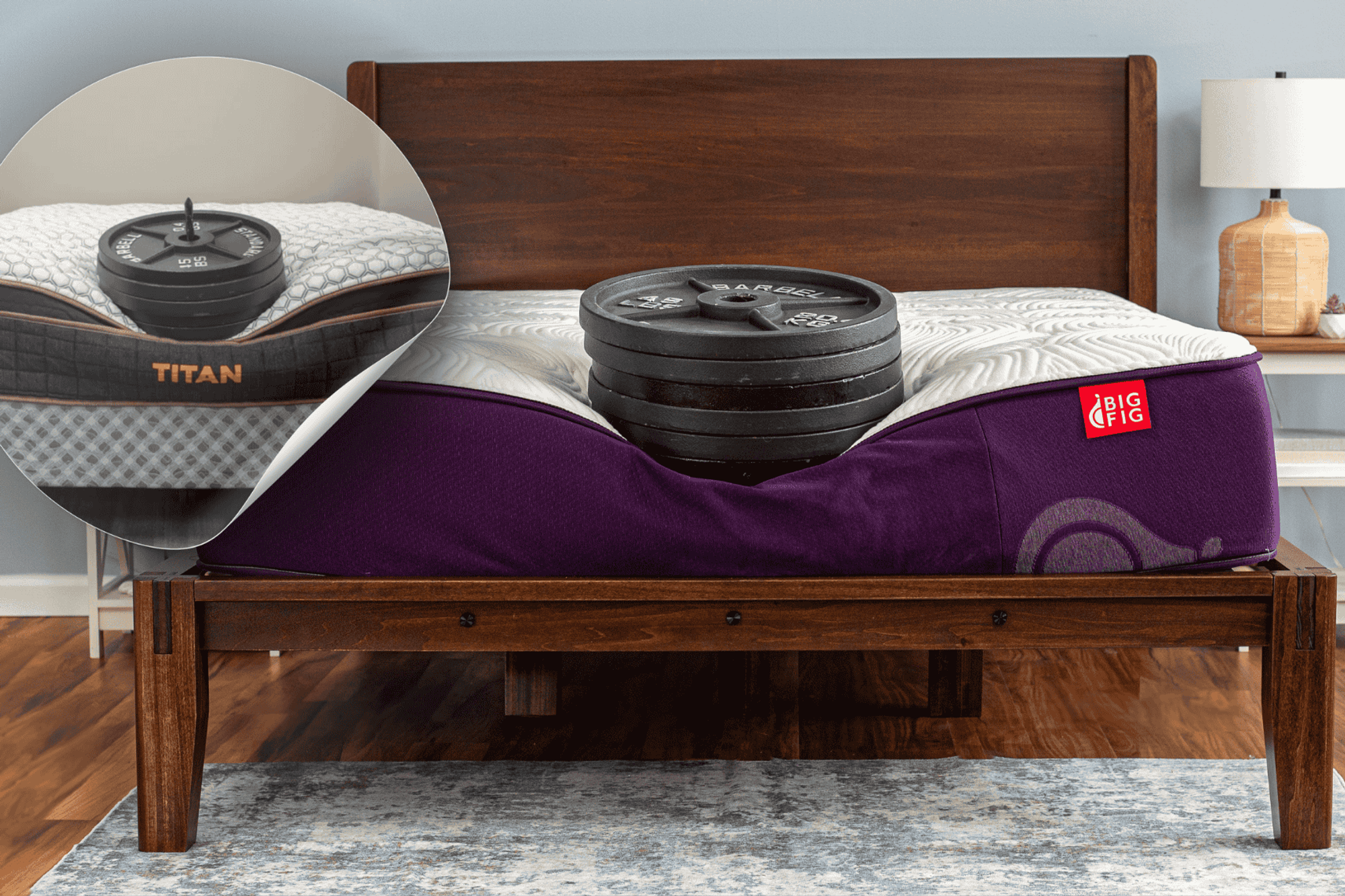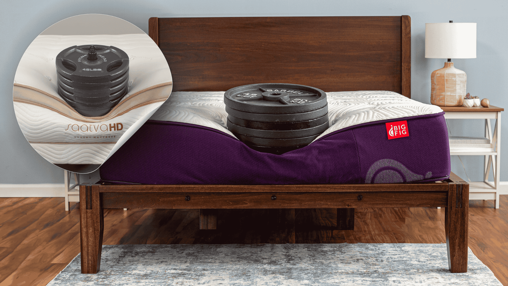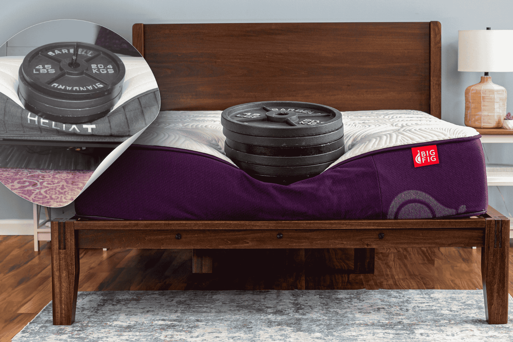 For the mattress weight stress test, we stack 45 lb. weighted plates to show the impact and support of up to 270 pounds of weight on the mattress. This number represents the same pounds per square for each 550-pound sleeper (Big Fig’s maximum weight capacity per sleeper) person sitting on the edge of the mattress.